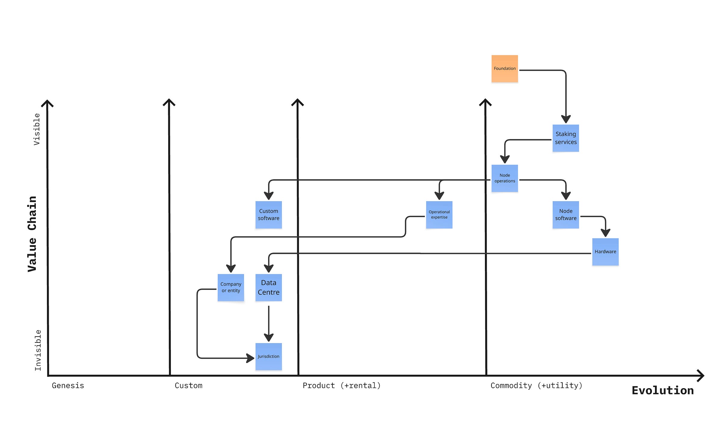 You could draw this map differently based on what stakers perceive, or want, from the value chain, versus what it actually looks like. From the perspective of the operator, it looks like the Foundation Wardley map, below, in both cases, but only in the Foundation case are the custom elements typically compensated at all.12