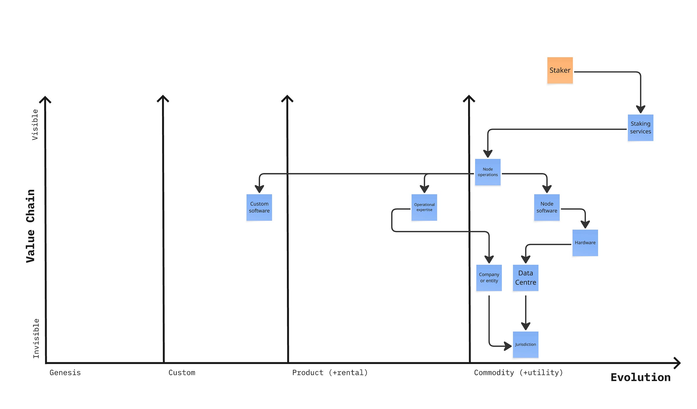 In fact, typically none of this is factored in by counterparties. In the two Wardley maps below,9 I’ve taken a rough approach at sketching out the value chain for validation. For consumer-level stakers, they often don’t care where a validator is based, or what their setup is. They just care about uptime and cost. This means they see the operational expertise as slightly less commodified, yet there’s not much custom beyond a brand.10 Most validators have some degree of custom software, even if it’s just for monitoring, that’s not something stakers will typically pay for.11